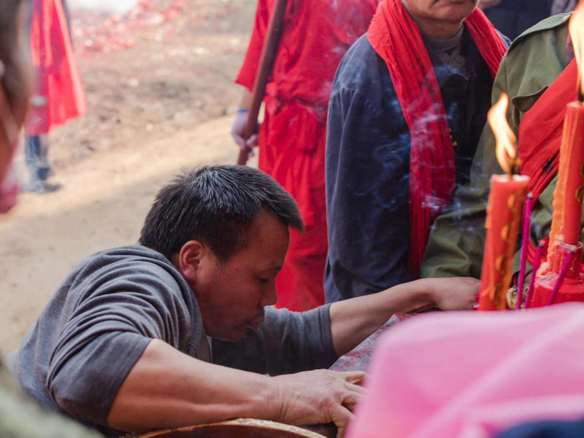 黄陂神秘民俗“僵狮子”。游狮之前,数个壮年男性穿黄、红马褂,跪在“头人”家堂屋里,头緾红巾,四周锣鼓齐敲鞭炮轰鸣,持续数十余分钟,只见头缠红巾者(偶有旁观者)猛然立起,不住抖动,口中念念有词,好象自称自已是刚下凡的某神,意识迷糊,力大无穷,接连会僵下几个“马脚”(也有的村叫“将军”),被僵者有的玩狮子,有的玩棍,有的指路,可数小时不累,途中有的“马脚”如神灵附体,不停击打香案祈福。于是游狮活动开始。摄于2018年3月武汉黄陂罗汉寺。