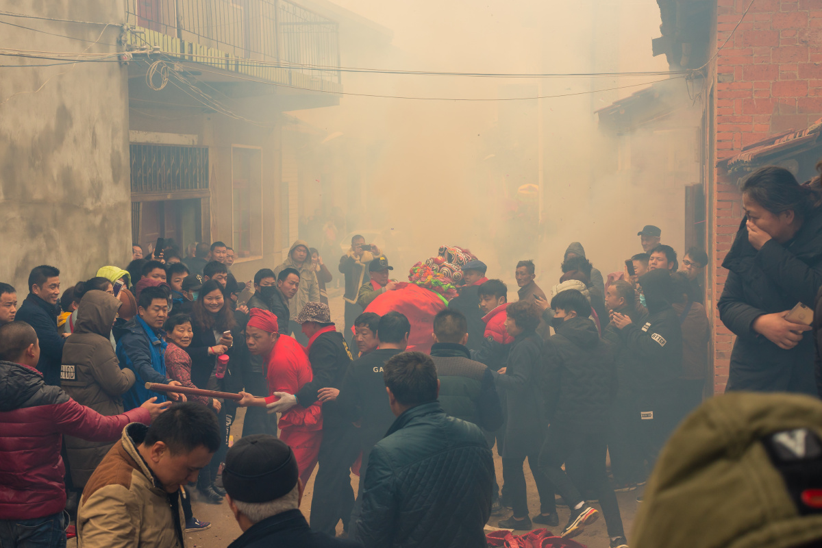 黄陂神秘民俗“僵狮子”。游狮之前,数个壮年男性穿黄、红马褂,跪在“头人”家堂屋里,头緾红巾,四周锣鼓齐敲鞭炮轰鸣,持续数十余分钟,只见头缠红巾者(偶有旁观者)猛然立起,不住抖动,口中念念有词,好象自称自已是刚下凡的某神,意识迷糊,力大无穷,接连会僵下几个“马脚”(也有的村叫“将军”),被僵者有的玩狮子,有的玩棍,有的指路,可数小时不累,途中有的“马脚”如神灵附体,不停击打香案祈福。于是游狮活动开始。摄于2018年3月武汉黄陂罗汉寺。摄于2018年3月武汉黄陂罗汉寺